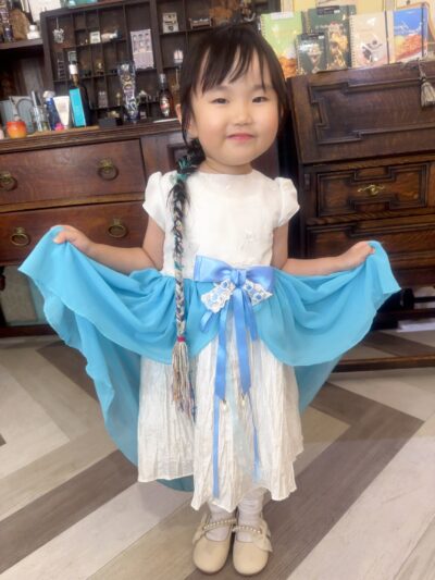 私のマタニティの時のドレスがちょうど水色だったので、それの裾をカットして!