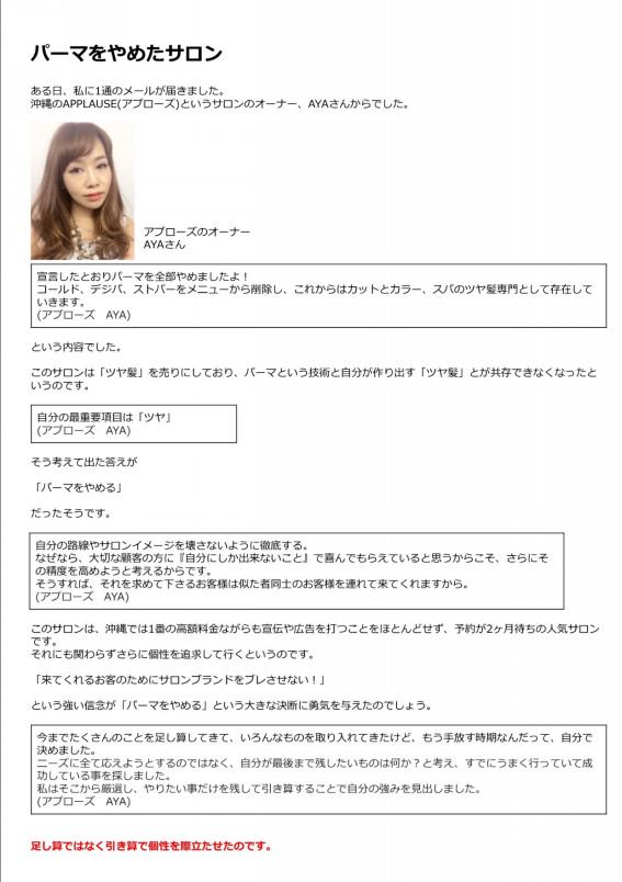 と私が思っているからです。だから私のニュースレターでAYAさんのように現場の・・・、サロンであるAPPLAUSEの、